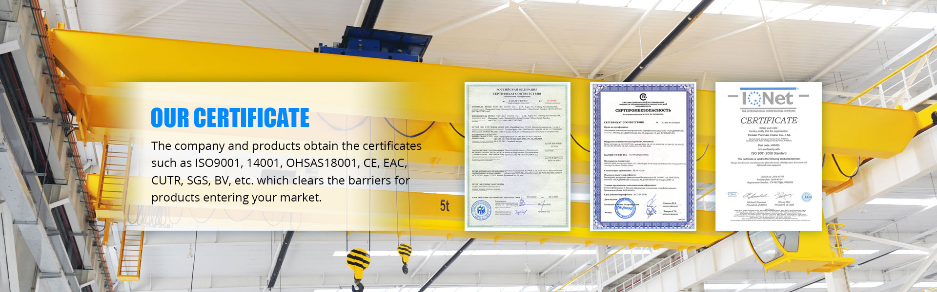 Potremmo fornirvi tutti i tipi di gru industriali da 0,25 tonnellate a 900 tonnellate, passare GB / T 19001-2000 idt ISO 9001: 2000, GB / T 24001-2004 idt ISO 14001: 2004, GB / T 28001-2001, OHSAS 18001: 1999, CE, GOST, SGS, TUV, BV e così via.